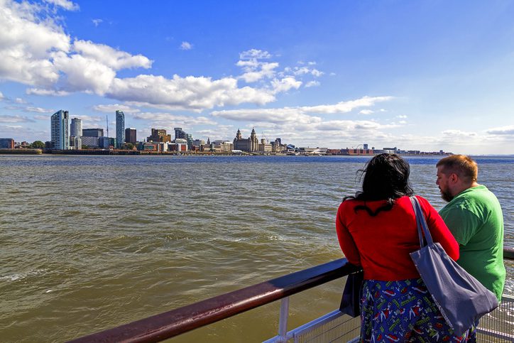 View form the ferry across the river Mersey towards Liverpool’s waterfront, UK People can be seen on the ferry